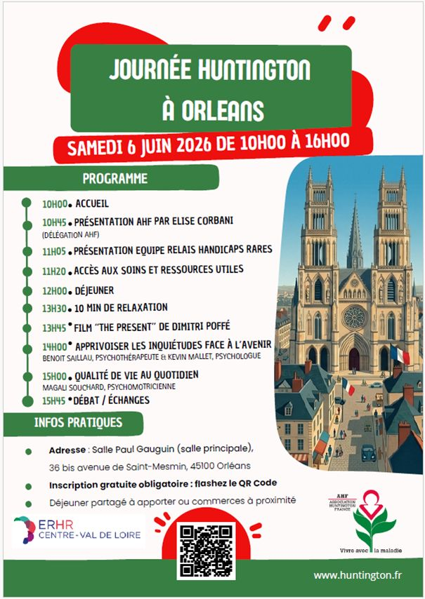 L’ASSOCIATION HUNTINGTON DE FRANCE et l’ERHR Centre Val de Loire vous invitent à une journée d’information et d’échanges dédiée à la maladie de Huntington.